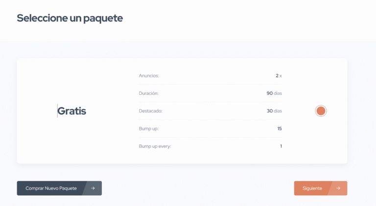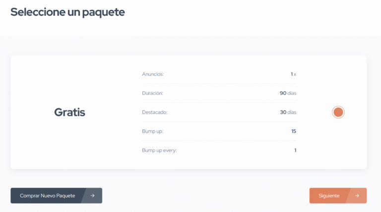 Marca opción de gratis, donde se muestra el circulo a la derecha de color naranja (el circulo estará en gris antes de ser seleccionado)